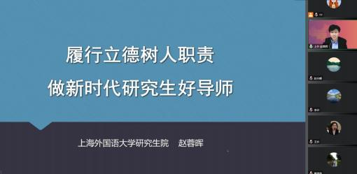 2022年11月3日晚7点,上海外国语大学 院长、博士生导师赵蓉晖教授应邀为我校全体研究生导师开展了题为“履行立德树人职责,做新时代研究生好导师”的专题讲座。本次讲座是我校研究生院组织开展的研究生导师综合能力提升专题培训的第⼀期活动,由研究生院院长、博士生导师赵永峰教授主持。讲座以线上方式进行,全体研究生导师参加培训,四川大学、西南大学等高校部分研究生导师也应邀参加本次活动。