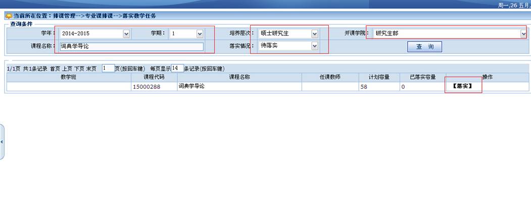1.在查询条件中输入正确的学年、学期。2.MTI的课程请选择翻译学院,其他学术型课程请选择研究生部。3.输入正确的课程名称.点击查询。4.点击落实,进入落实页面。如图: