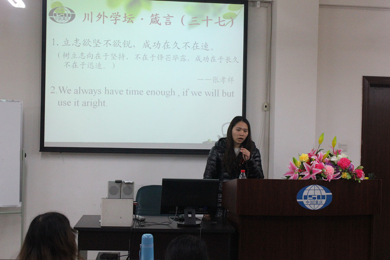 首先,2013级研究生高梦婷同学向大家分享了她精心挑选的两则箴言:“立志欲坚不欲锐,成功在久不在速。——张孝祥”、“We always have time enough, if we will but use it aright.——Goethe”,借此强调坚持及善用时间的重要性。