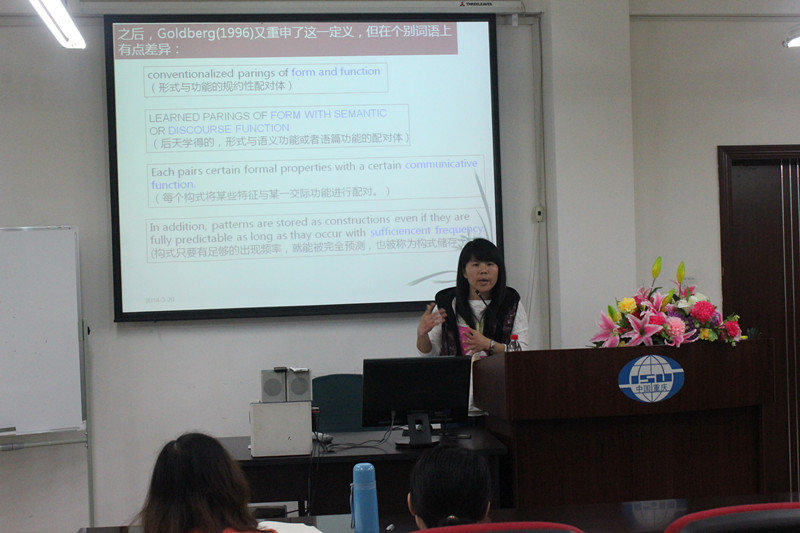 2014年3月20日晚上7:00,川外学坛“学子之星”学术讨论在博文楼六楼报告厅如期举行。本次学坛由贺丽璇同学主持,2012级研究生任瑞娟同学围绕“构式语法”这一主题为大家做了精彩的报告。姜孟教授和四川大学曾国才博士同饱含学术热情的研究生们一起听取了此次报告。