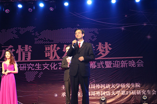 四川外国语大学校长李克勇教授为晚会致辞,李校长在致辞中表达了对全体研究生新同学的欢迎和祝福,也鼓励研究生同学在校期间积极参加文化活动,丰富自己的研究生生活。