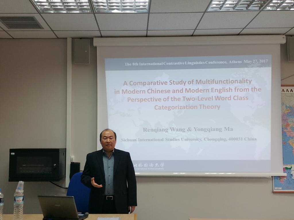 2017年5月25日至28日,“第8届国际对比语言学研讨会”(ICLC-8)在希腊雅典大学成功举行,来自20多个国家的120多位专家学者参加了本次会议。本次会议共邀请来自5个国家的5位知名学者做大会主旨发言,学术研讨分成4个论坛进行,共84场次。我校博士生导师、 院长、学科办主任兼词典学研究所所长王仁强教授应邀出席本次研讨会,并于当地时间5月27日上午以“AComparativeStudy ofMultifunctionality inModern Chinese andModern English from thePerspective ofTwo-levelWordClassCategorizationTheory”(从双层词类范畴化理论看现代汉语和现代英语中的兼类现象)为题进行了交流发言,由大会组委会主席、希腊雅典大学Giannoula Giannoulopoulou教授主持。