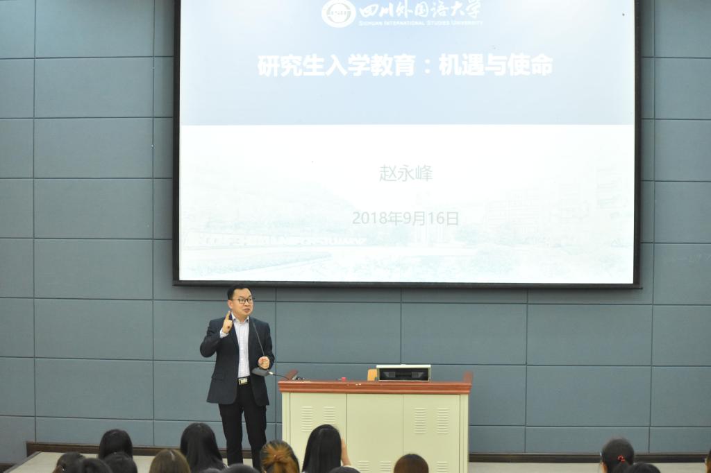 9月16日下午3点,四川外国语大学2018级 新生入学教育在教学楼B栋报告厅举行。会议由辅导员吕贺老师主持, 副院长赵永峰教授主讲。