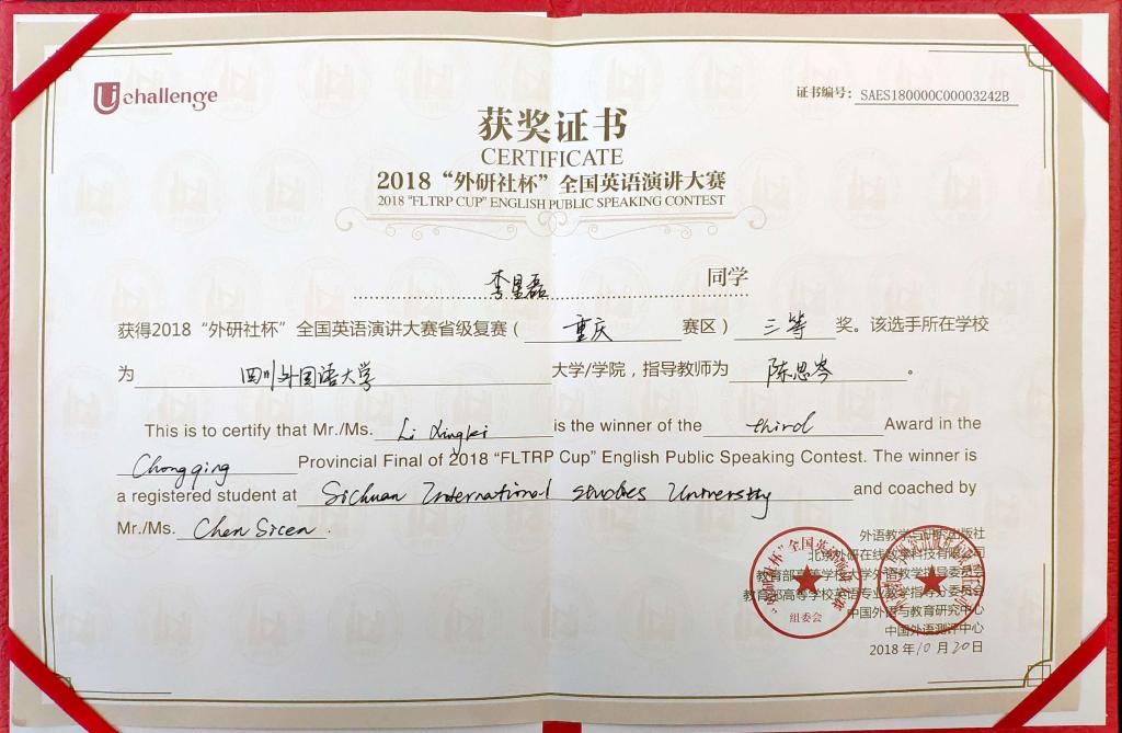 2018年10月20日上午,由重庆市大学外语教学研究会、重庆市外交学会主办,重庆师范大学承办的第28届“外研社•国才杯”大学生英语演讲大赛在重庆师范大学落下帷幕。我校研究生李星磊在复赛中以出色的表现勇夺重庆赛区非英语专业研究生组一等奖。