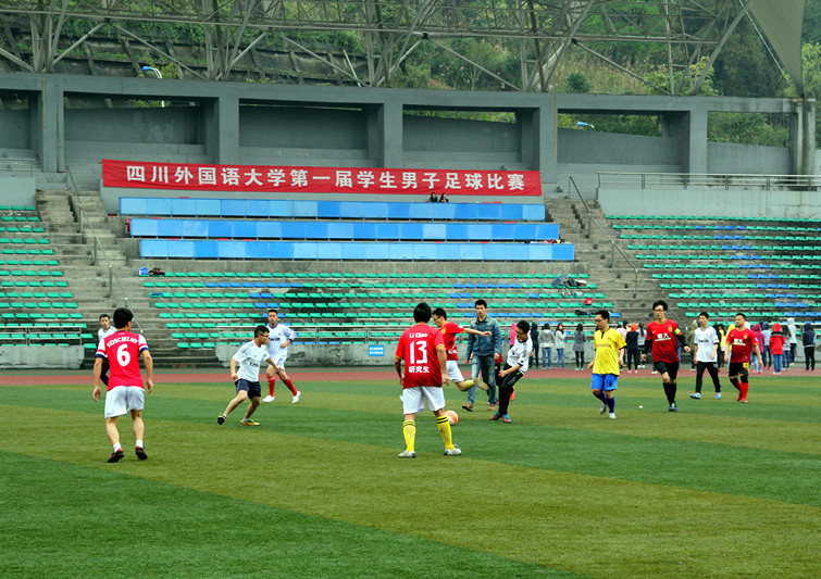 2014年3月31日,四川外国语大学第一届学生男子足球比赛四强赛在西区体育场开赛。中午12:40开始的一场比赛中,研院男足对阵国际商学院高年级队。