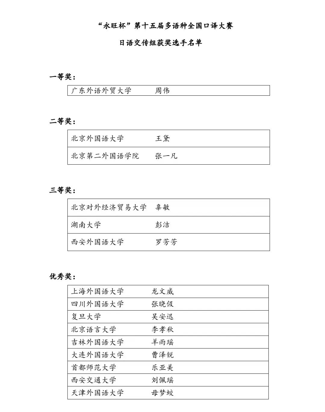 下午的决赛中,乐宇梵同学沉着冷静,思维清晰,中日语译文流畅准确,经受住了评委的严格评判,征服了所有评委及观赛人员,最终斩获日语同声传译组一等奖。这也是我校学子自参加此项全国级口译大赛以来首次夺魁。