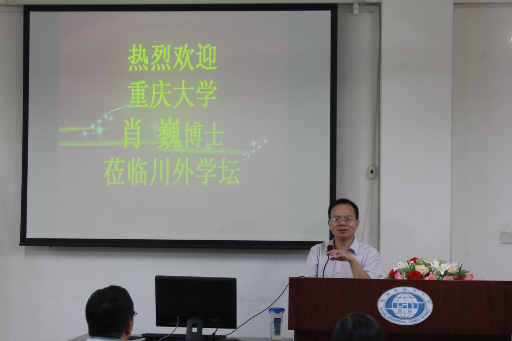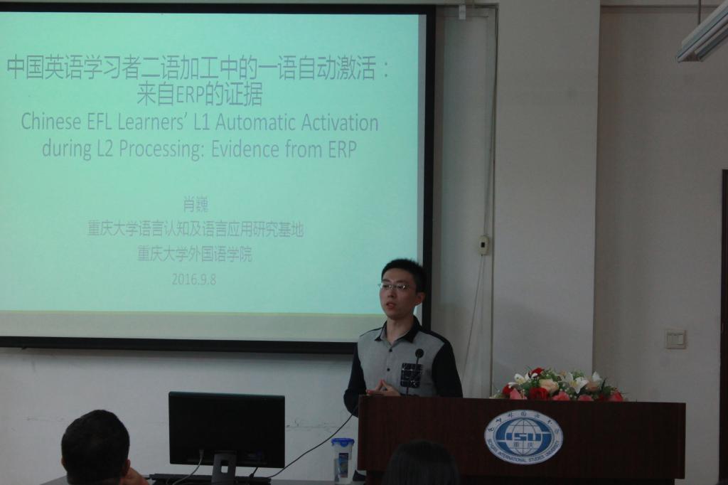 2016年9月8日晚上7:00,重庆大学外国语学院硕士生导师、重庆大学语言认知及语言应用研究基地专职研究员肖巍博士应邀在博文楼六楼报告厅举行题为“中国英语学习者二语加工中的一语自动激活:来自ERP的证据”的学术讲座。讲座由姜孟教授主持,我校部分博士生、青年教师、硕士研究生参加了本次学坛活动。