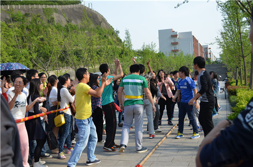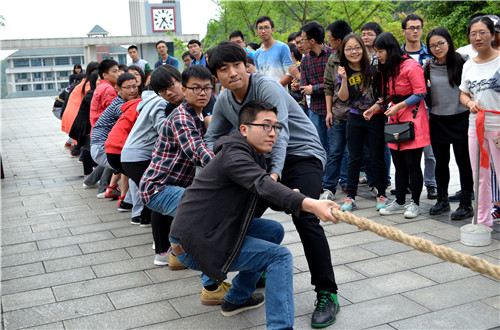 4月10日下午,研院队对战英语13级队。前来观赛的同学们早早地聚集在景观大道上。利用开场前的间隙时间,队长叮嘱队员们放松心态,集中精力;拉拉队员们也纷纷上前鼓劲。比赛开始后,我方队员们奋力向后拉绳,身体重心一致向下。伴着啦啦队员们响彻云霄、整齐划一的口号,指示标志从绳子中线位置渐渐地往我方移动。此时我方队员们依然咬紧牙关,有节奏地向后使劲儿。20秒过后,研院队拿下了首局的胜利。次轮比赛,双方交换场地。尽管经过第一轮较量,双方体能均有所消耗,但我方队员仍是心往一处想,劲往一处使,只听一声清脆的哨响,裁判员宣布研院队获胜,人群爆发出热烈的欢呼声。