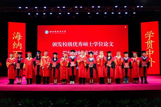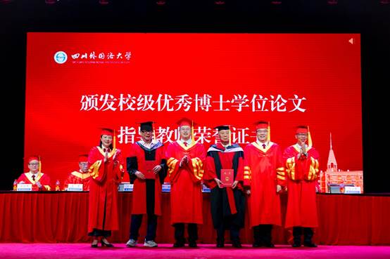 副校长李彦宣读《重庆市教育委员会关于对普通高校2022年学生先进个人和先进集体予以表扬的通报》和《四川外国语大学关于表彰2022年优秀毕业生的决定》,全体校领导为2022年重庆市普通高等教育优秀毕业研究生和2022年校级优秀毕业研究生颁发荣誉证书。