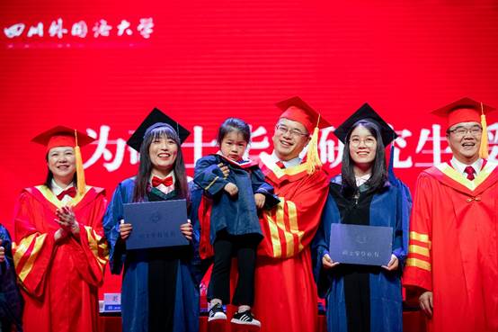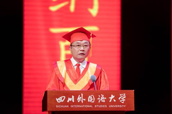 一要以理想之灯,照亮时代之路。“希望你们用自己的奉献之声,用自己的担当谱写时代的最强音;希望你们努力成为道德高尚的人、国家有用之才;希望你们珍惜花样年华,去拼搏,去奋斗,去努力,担起青春使命,勇攀时代高峰”。二要铭记校训,身体力行。他解读了川外校训的丰富内涵和对学子的殷切期望:“海纳百川”是川外人“德与行”的追求,“学贯中外”是川外人“才与学”的目标。这一校训凝聚着学校对代代学者的殷切期望。海纳百川,意味着我们有崇高的德行和追求,有兼容并蓄的境界和大气。学贯中外,要求我们要有融通中外文明成果的胸襟和理想。三要学会“做事”与“做人”。新时代的川外研究生要学会“做事”与“做人”:一方面是要把在校园里学到的知识转化为实际工作中解决问题的能力,学会创新性解决问题,学会“做事”;另一方面是要找准自己的人生定位和目标追求,不可以好高骛远,要以正确的价值观处理好个人追求与国家需要的关系,明确自己的目标定位,学会“做人”。理解了“做事”与“做人”的辩证统一关系,方能成为一个有高度的人。四要学会感恩。他叮嘱毕业生:“生活不能只是索取,更要施予。要学会爱人,爱绿草和树荫,爱生活中的点点滴滴,我们要感恩生活,感恩父母。”