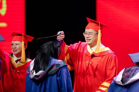 全体校领导向获得博士学位的研究生和获得硕士学位的研究生授位并颁发学位证书,为毕业生拨穗正冠,并合影留念。