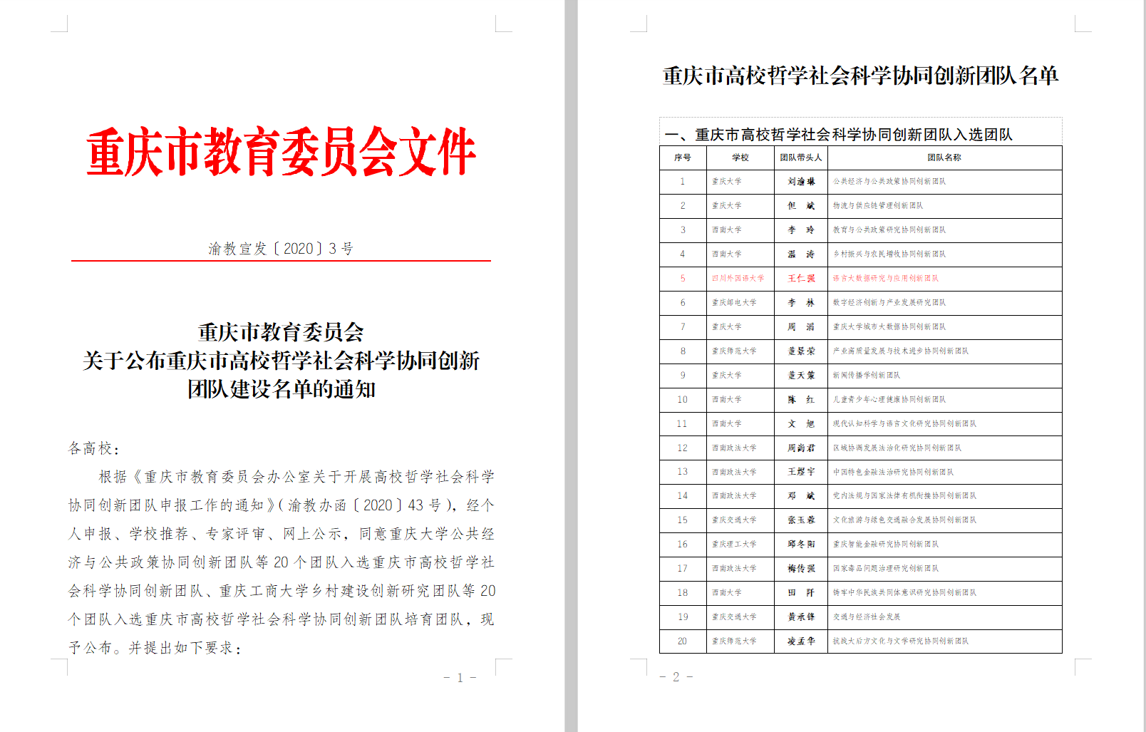 近日,重庆市教委公布重庆市高校哲学社会科学协同创新团队建设名单,我校王仁强教授牵头的“语言大数据研究与应用创新团队”成功入选重庆市高校哲学社会科学协同创新团队。