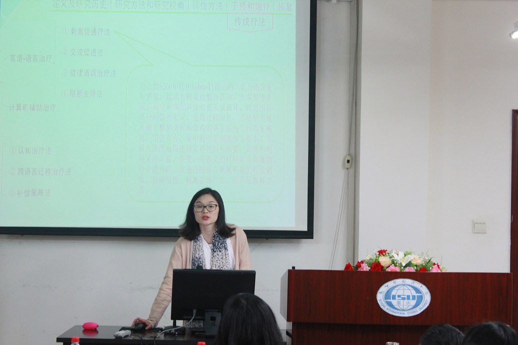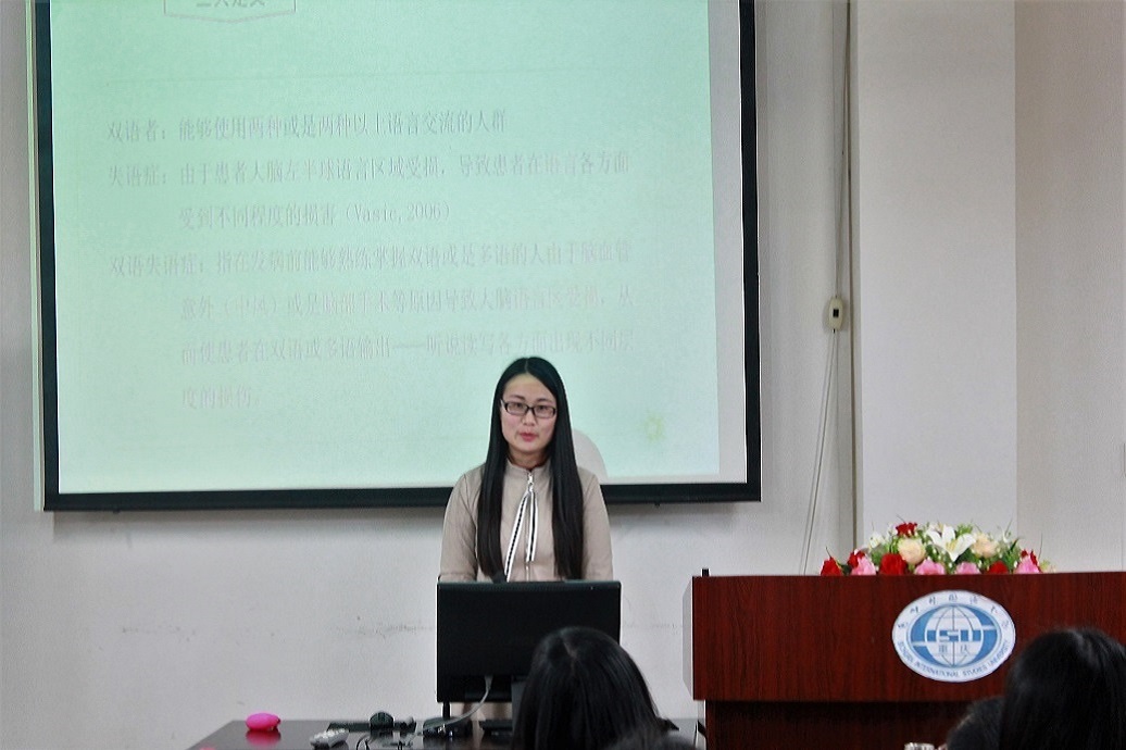 2017年3月9日晚上7:00,川外学坛“学子之星”学术讨论会在博文楼六楼报告厅顺利举行。本次讨论会的主题为“国内外双语失语症的研究进展”,主讲人是2015级研究生曹英倩同学和李爱莲同学。此次讲座由2015级研究生荣彩秀同学主持,姜孟教授、邬德平博士、牟丽老师、何巧玲老师等出席,此外各年级研究生参与了本次讲座。