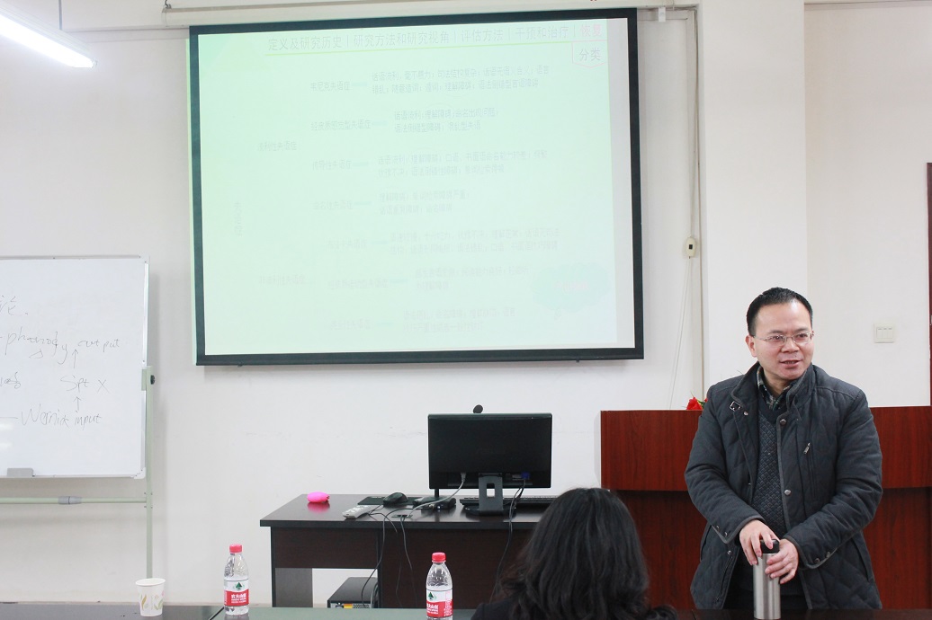 最后,现场师生与主讲人进行了热烈的互动。邬德平博士和牟丽老师对此次讲解作了点评和指导,并高度肯定了此次讲座开展的意义。接着姜孟教授也进行了简要总结。姜教授指出,此次讲座意义深远,是我校语言病理学系列讲座的开篇之作,开启了我校针对语言病理学的研究之门。肯定之余,姜教授也指出了其中的不足,对讲座内容和形式提出了一些建设性的意见,使在座的各位收获颇丰。
