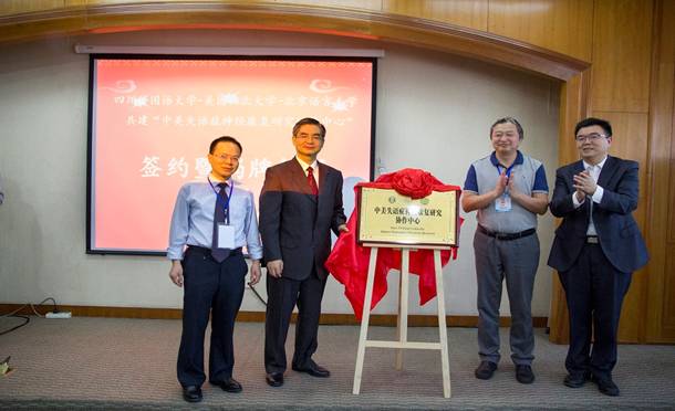 接着,举行“中美失语症神经康复研究协作中心”揭牌仪式,仪式由南京师范大学外国语学院倪传斌教授主持。姜孟教授、高立群教授分别代表四川外国语大学语言脑科学研究中心与北京语言大学语言康复学院签订了“研究协作”协议,四川外国语大学李克勇校长、董洪川副校长共同为“中美失语症神经康复研究协作中心”揭牌。随后,董洪川副校长发表了讲话。他表示,外语院校应深入思考如何在“双一流”建设的背景下保持人文学科“不失语”,如何深化改革以服务当代国家建设和学科发展战略需求。