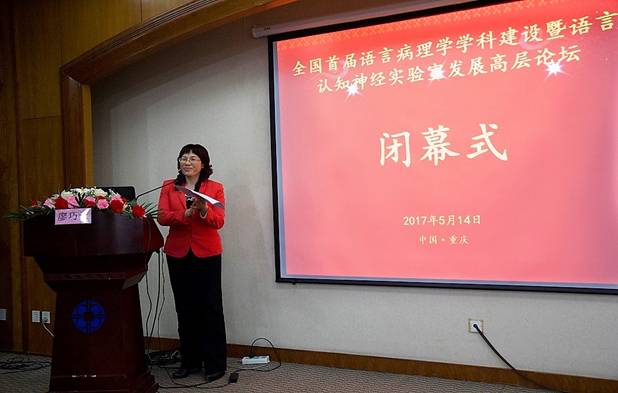 最后,四川外国语大学廖巧云教授以中国认知神经语言学研究会副会长身份致闭幕辞。廖巧云教授指出,此次高层论坛主题突出、内容丰富、跨学科跨领域特征鲜明,是一场启发思想、充满智慧的学术交流。同时,她希望各高校与医疗院所进一步加强交流与合作,以促进我国语言康复事业的发展。