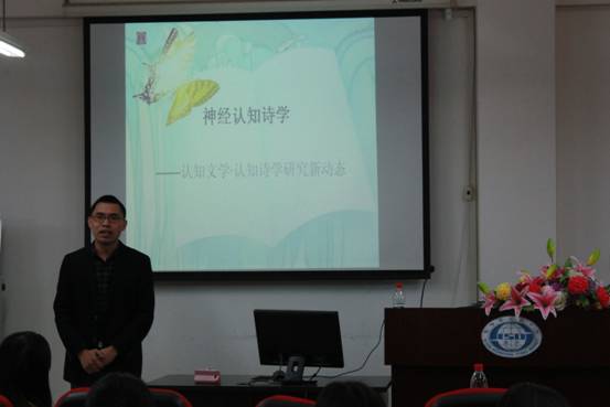 在报告开始前,姜孟教授向同学们简要介绍了神经认知诗学的研究背景。